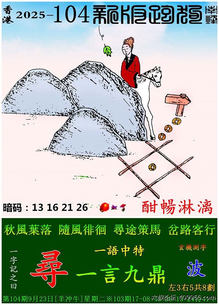 104期新版跑狗一字記之曰:【尋】 玄機測字:《波》 一語中特:一言九鼎