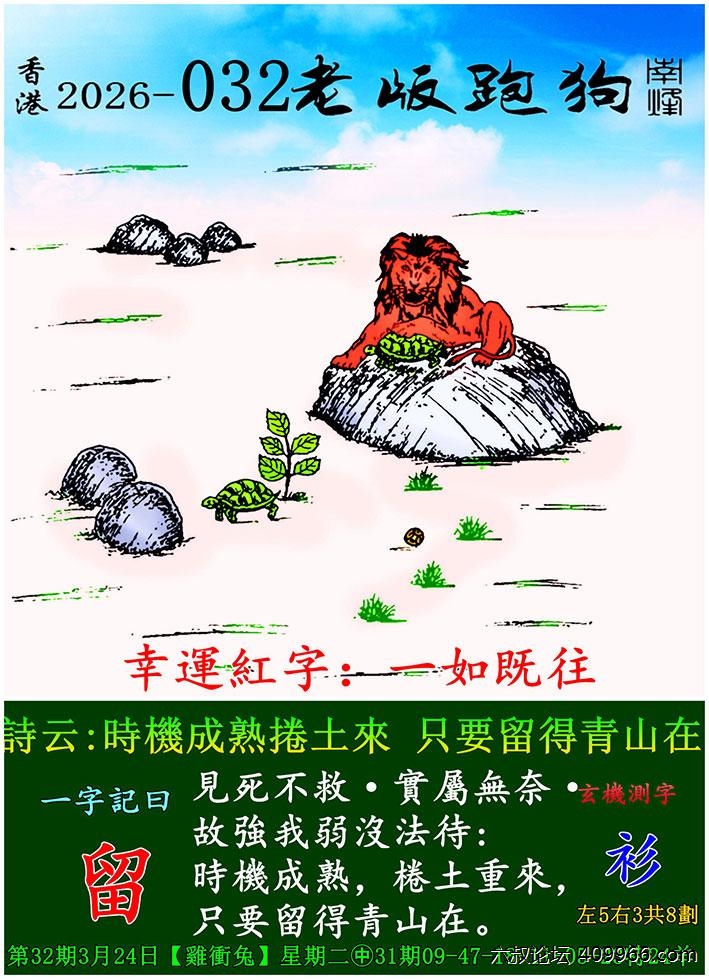 032期老版跑狗一字記之曰:【留】 詩雲:時機成熟捲土來,只要留得青山在。
