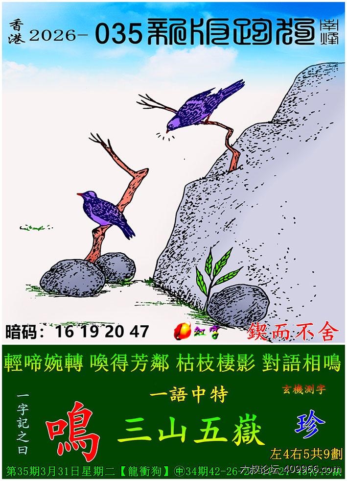 035期新版跑狗一字記之曰:【鳴】 玄機測字:《珍》 一語中特:三山五嶽