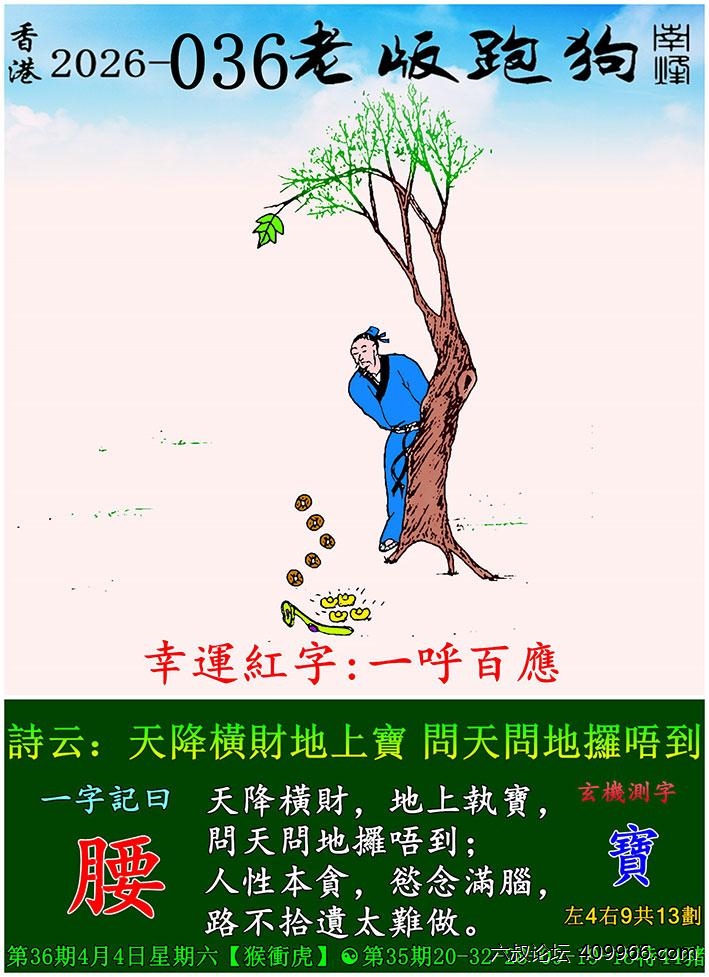 036期老版跑狗一字記之曰:【腰】 詩雲:天降橫財地上寶,問天問地攞唔到。