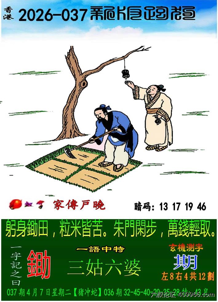 037期新版跑狗一字記之曰:【鋤】 玄機測字:《期》 一語中特:三姑六婆